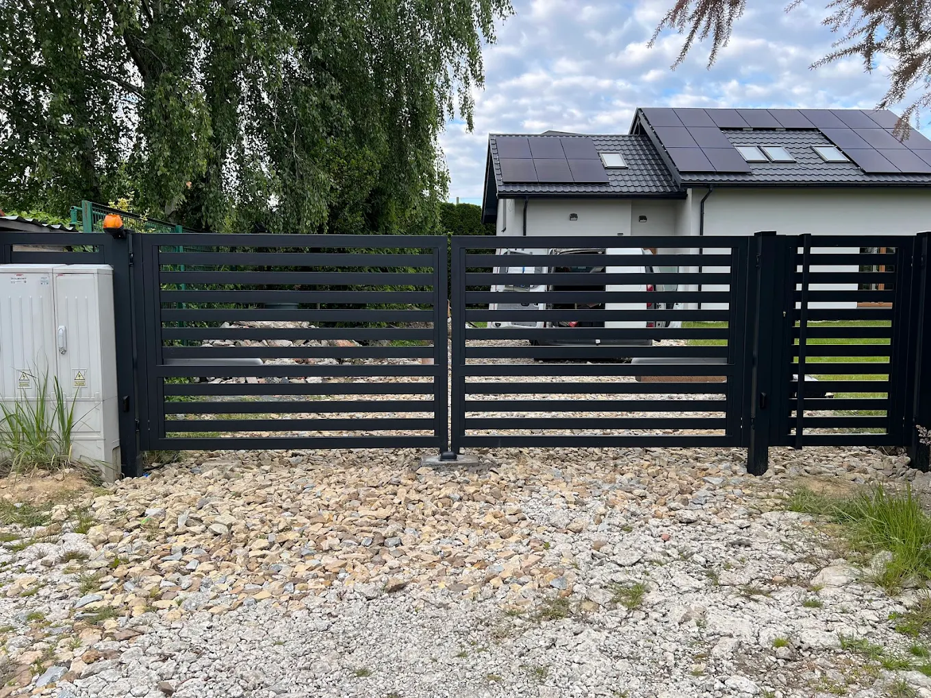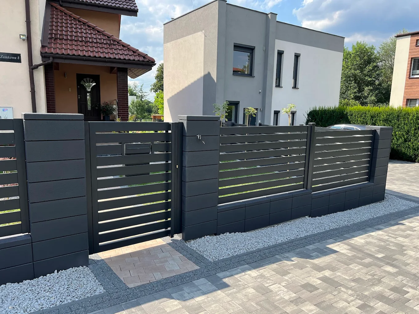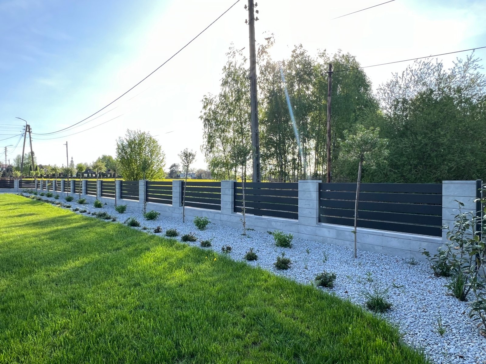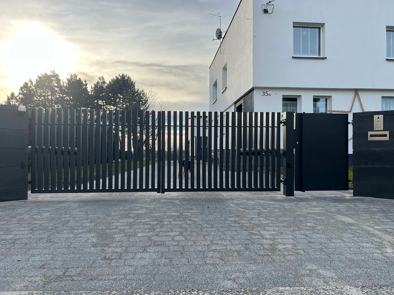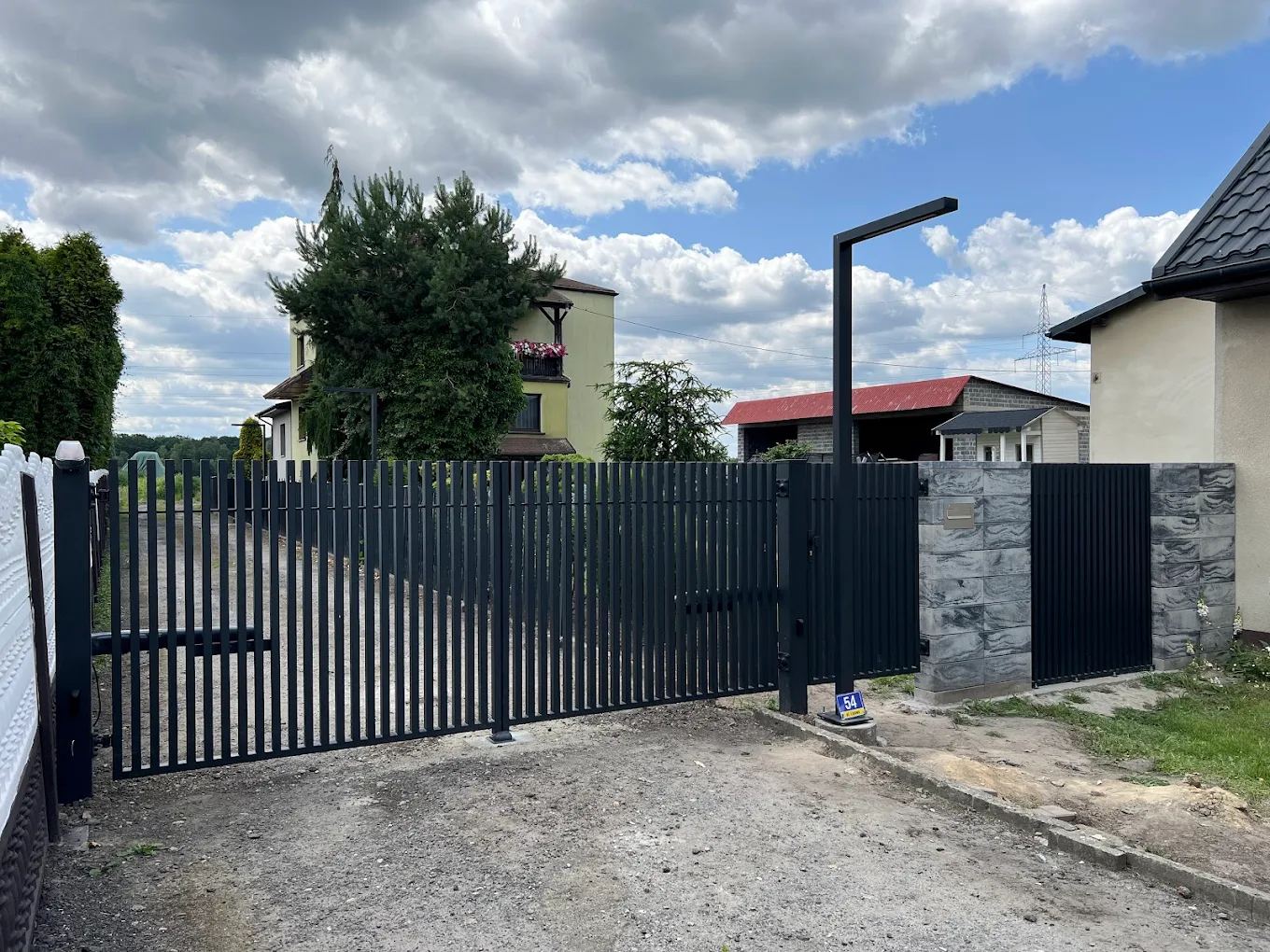 Realizacja ogrodzenia stalowego z przęsłami poziomymi oraz bramą przesuwną. Konstrukcja zabezpieczona antykorozyjnie, montaż wykonany na terenie inwestycji prywatnej.