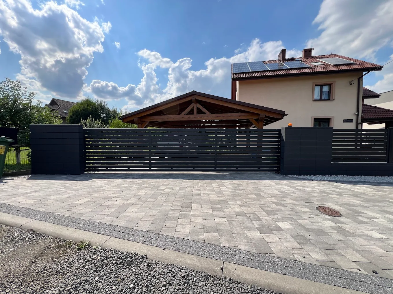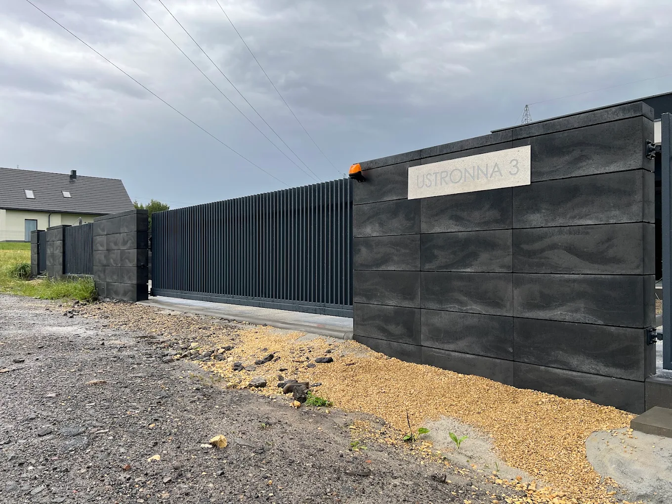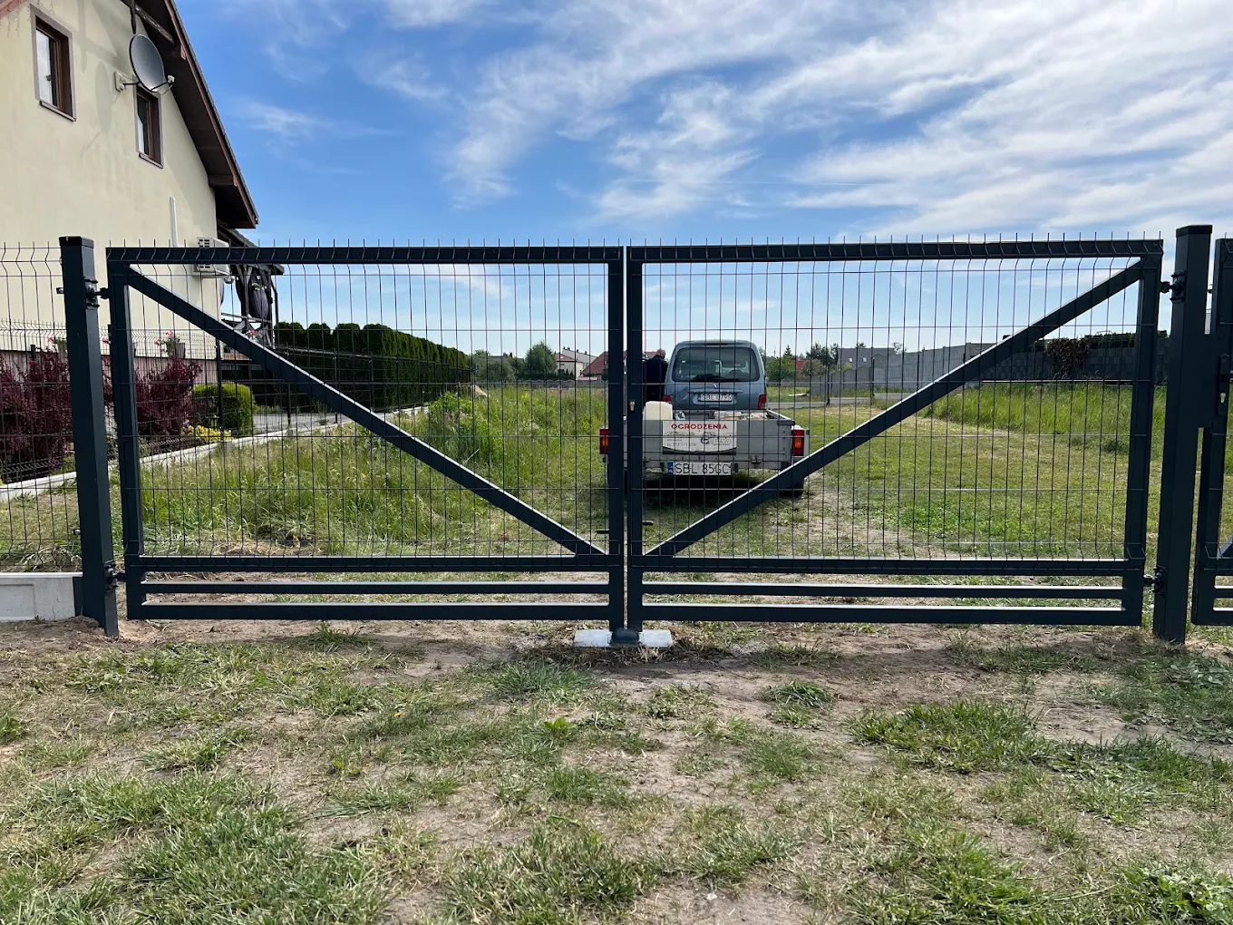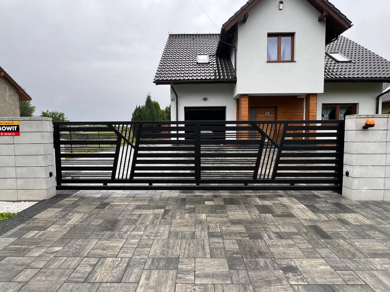 Realizacja ogrodzenia stalowego z przęsłami poziomymi oraz bramą przesuwną. Konstrukcja zabezpieczona antykorozyjnie, montaż wykonany na terenie inwestycji prywatnej.
